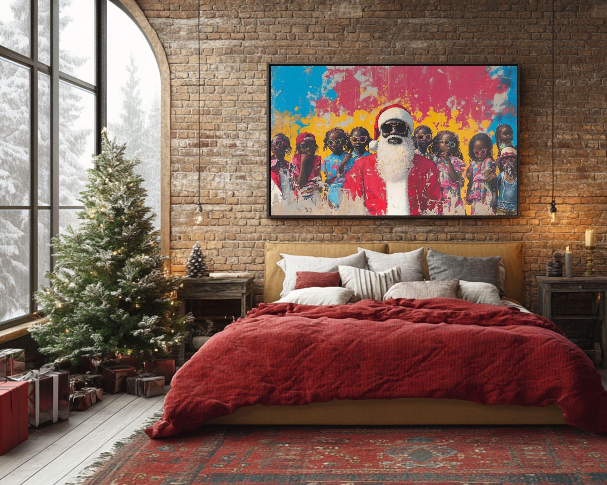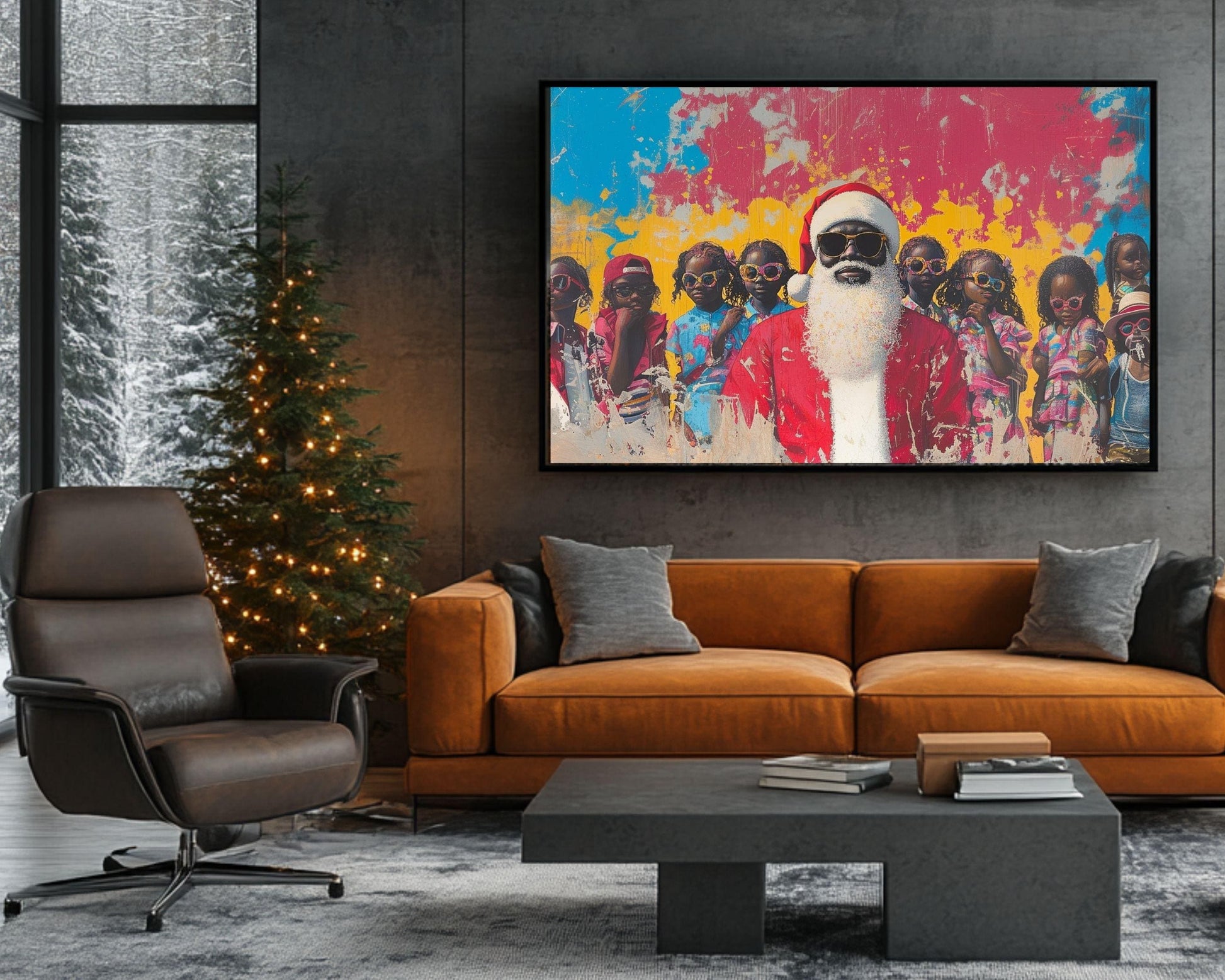 Inject your home with a splash of color and joy this Christmas season! This dynamic artwork features a modern, African American Santa surrounded by stylish kids, all rocking sunglasses. The bright, expressive colors of pink, yellow, and blue create a bold statement piece, perfect for the holiday season.