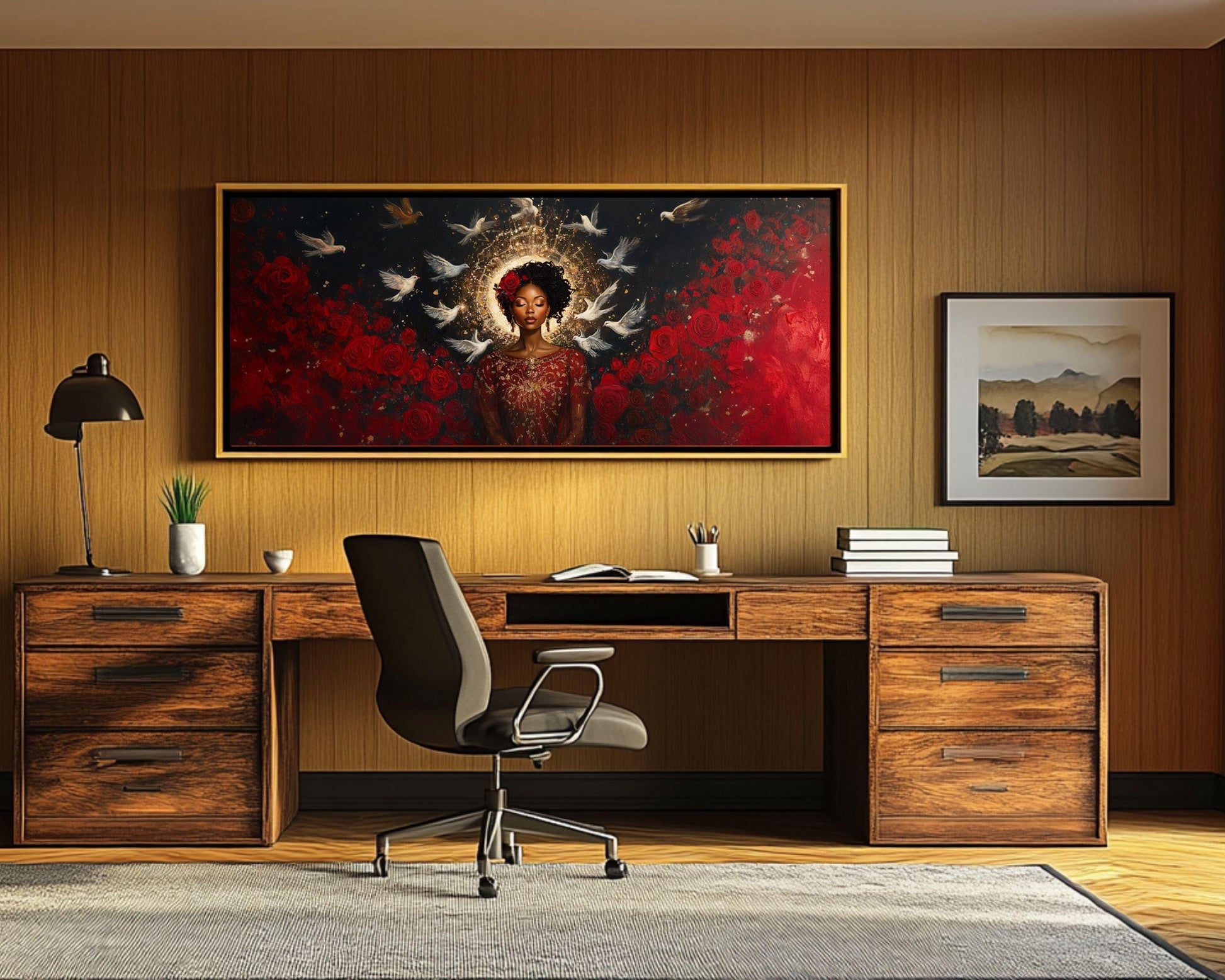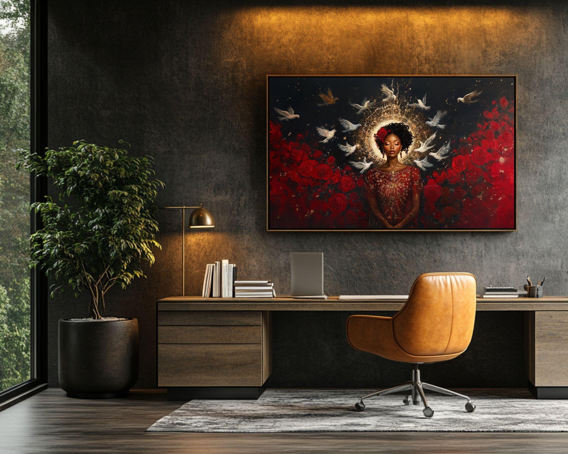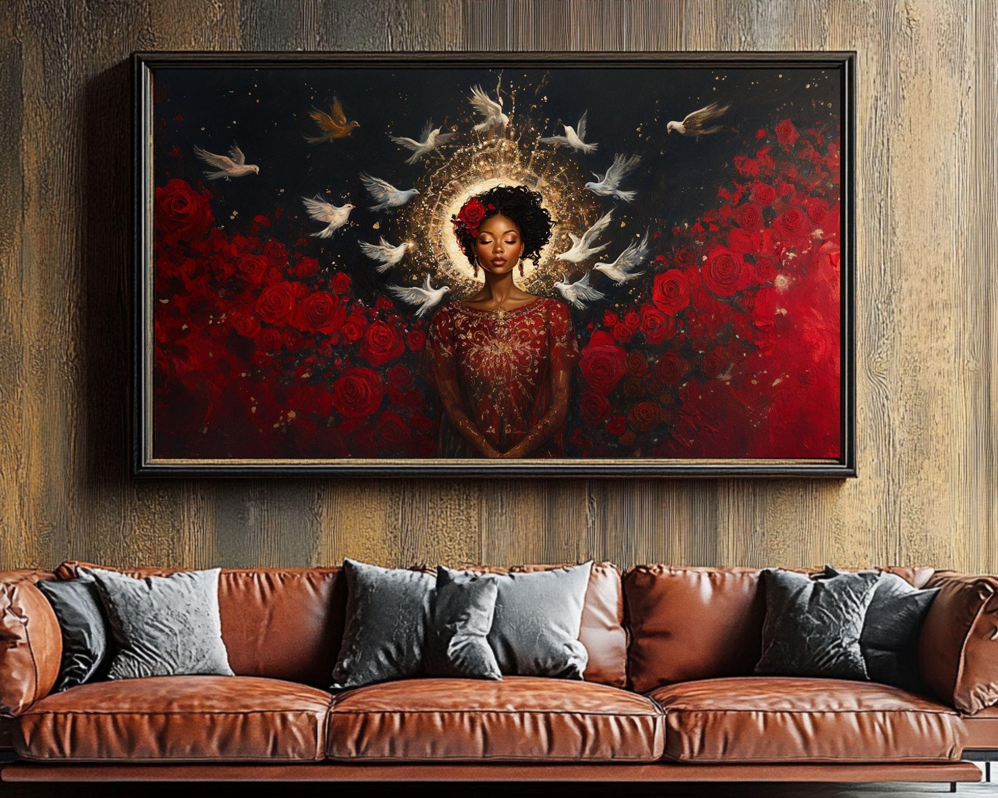Bring celestial elegance and cultural empowerment into your home with this breathtaking canvas artwork inspired by Harmonia Rosales. Featuring a goddess-like Black woman with a radiant halo, surrounded by white doves and lush red roses, this piece symbolizes divine femininity, grace, and strength. Perfect for meditation spaces, bedrooms, or living rooms, this artwork radiates spirituality and cultural pride, making it an unforgettable addition to any decor.