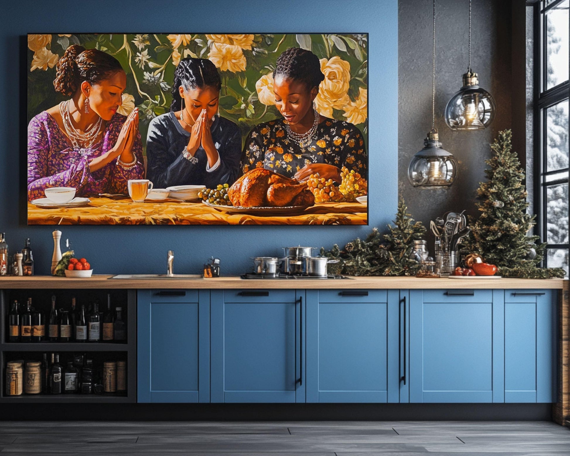 This beautiful artwork captures a Black family in a moment of prayer before their Thanksgiving meal, reflecting the importance of family, gratitude, and tradition. Ideal for adding warmth and festivity to your Thanksgiving home decor, this canvas embodies the spirit of togetherness and thankfulness.
